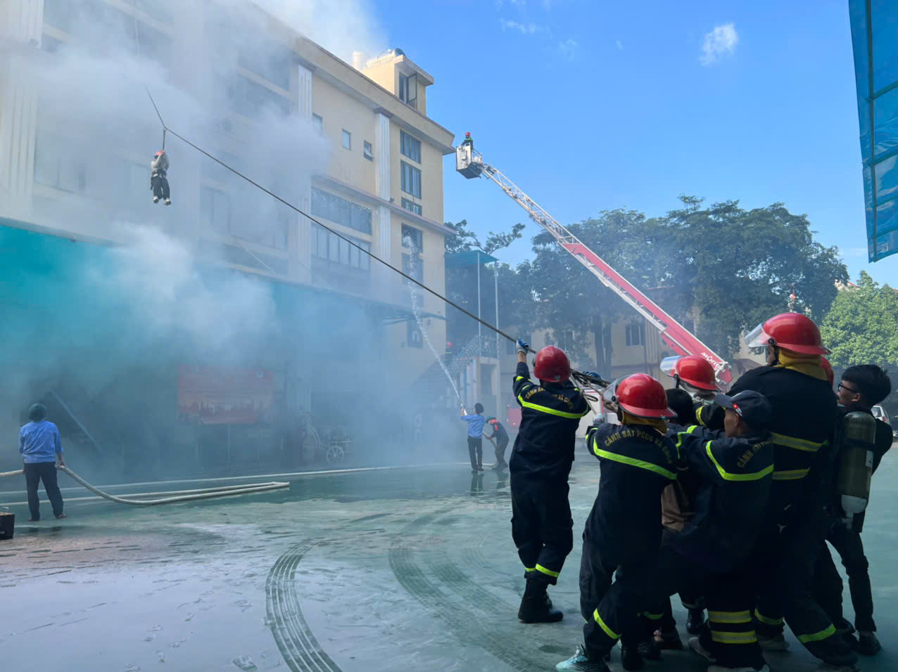 Thực hiện Kế hoạch số 1599/KH-PC07-KVVY, ngày 10/10/2025 của Phòng Cảnh sát Phòng cháy, chữa cháy và Cứu nạn, cứu hộ (PCCC&CNCH) Công an tỉnh Phú Thọ về việc tổ chức thực tập Phương án chữa cháy và cứu nạn, cứu hộ có huy động nhiều lực lượng, phương tiện của các cơ quan, đơn vị, ngày 18/10/2025, Đội Chữa cháy và Cứu nạn, cứu hộ khu vực Vĩnh Yên đã phối hợp với Công ty Cổ phần Giày Vĩnh Yên tổ chức buổi thực tập Phương án PCCC&CNCH tại trụ sở công ty.