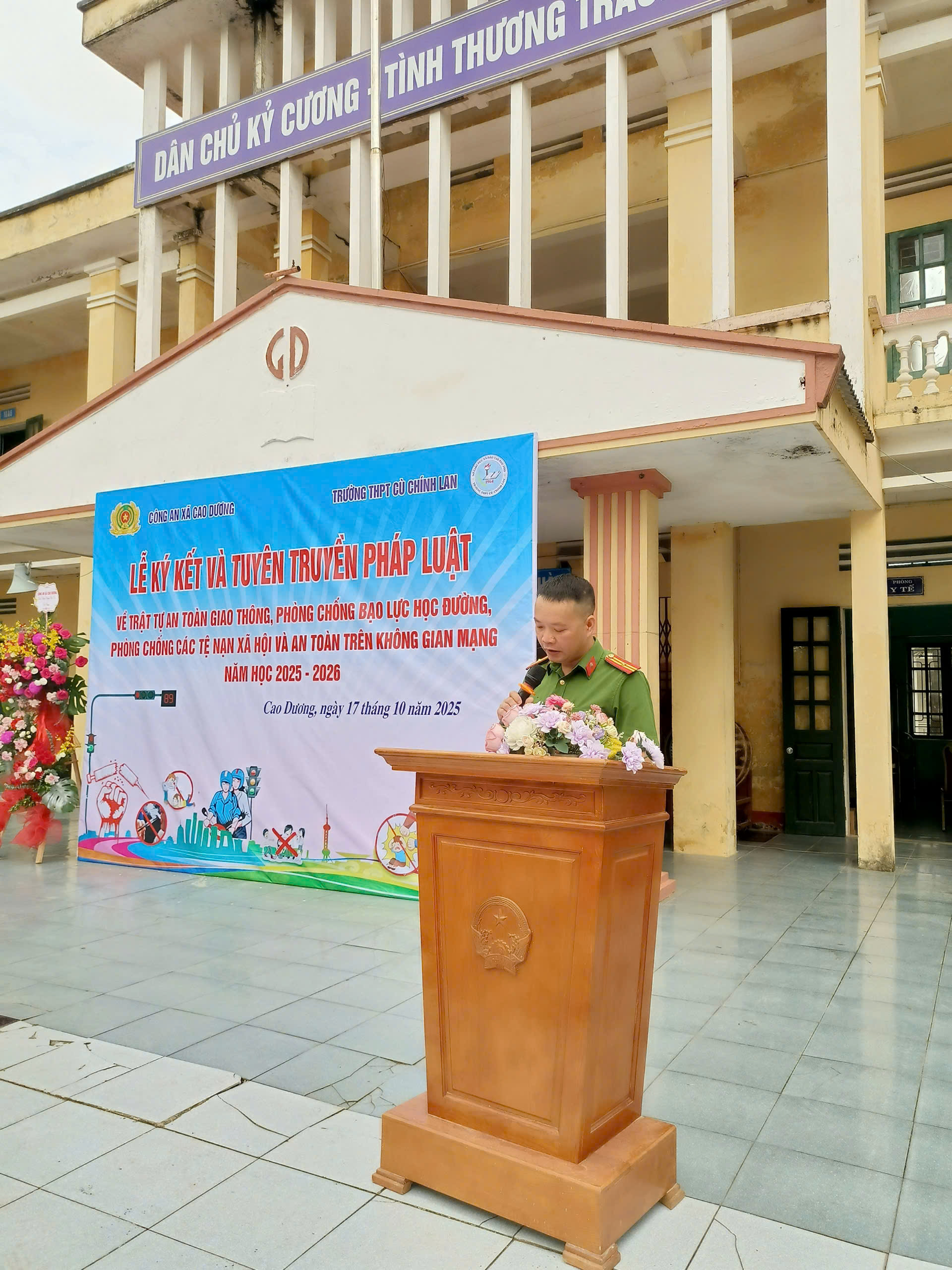Nhằm nâng cao nhận thức, ý thức chấp hành pháp luật cho học sinh, góp phần phòng ngừa vi phạm pháp luật và tệ nạn xã hội trong trường học, sáng ngày 17/10/2025, Công an xã Cao Dương phối hợp với Trường THPT Cù Chính Lan tổ chức Lễ ký kết và tuyên truyền pháp luật về trật tự, an toàn giao thông, phòng chống bạo lực học đường, phòng chống tệ nạn xã hội và an toàn trên không gian mạng.