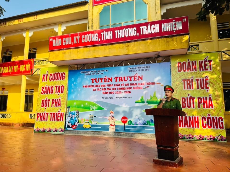 Nhằm nâng cao nhận thức pháp luật, xây dựng môi trường giáo dục an toàn, lành mạnh, sáng ngày 13/10/2025, Công an xã Tây Cốc phối hợp với Trường THPT Quế Lâm tổ chức buổi tuyên truyền, phổ biến giáo dục pháp luật về an toàn giao thông và phòng, chống ma túy, thuốc lá điện tử cho cán bộ, giáo viên và học sinh nhà trường.