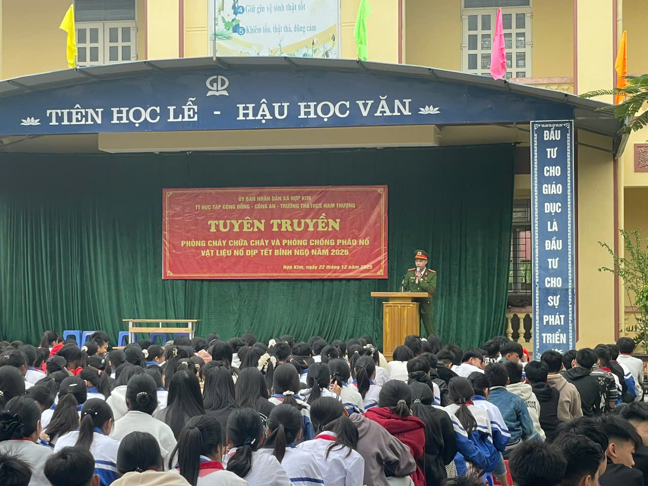 Nhằm nâng cao nhận thức, kỹ năng phòng ngừa cháy, nổ và chấp hành các quy định của pháp luật trong dịp Tết Nguyên đán Bính Ngọ 2026, sáng ngày 22/12/2025, Công an xã Hợp Kim phối hợp với Ủy ban nhân dân xã và Trung tâm học tập cộng đồng xã tổ chức buổi tuyên truyền, phổ biến pháp luật về phòng cháy, chữa cháy và phòng, chống pháo nổ tại Trường Tiểu học và Trung học cơ sở Nam Thượng.